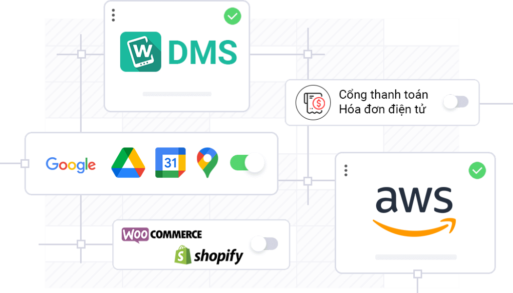 Chỉ cần vài thiết lập kết nối đơn giản giữa ERPNext và hệ thống khác như: Phần mềm DMS, Amazon AWS, Google Drive, Cổng thanh toán, Hóa đơn điện tử, Trang TMĐT...giúp bạn đồng bộ hóa dữ liệu tức thì.