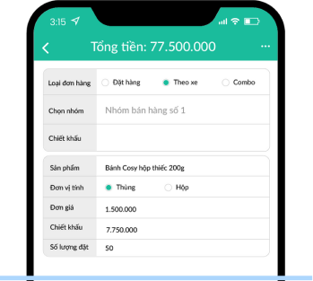 Tối ưu hóa đầu ra từ hoạt động bán hàng Van-Sales của doanh nghiệp. Nhân viên dễ dàng lên đơn hàng theo xe, hỗ trợ tự động ghi công nợ trong 1 nền tảng duy nhất